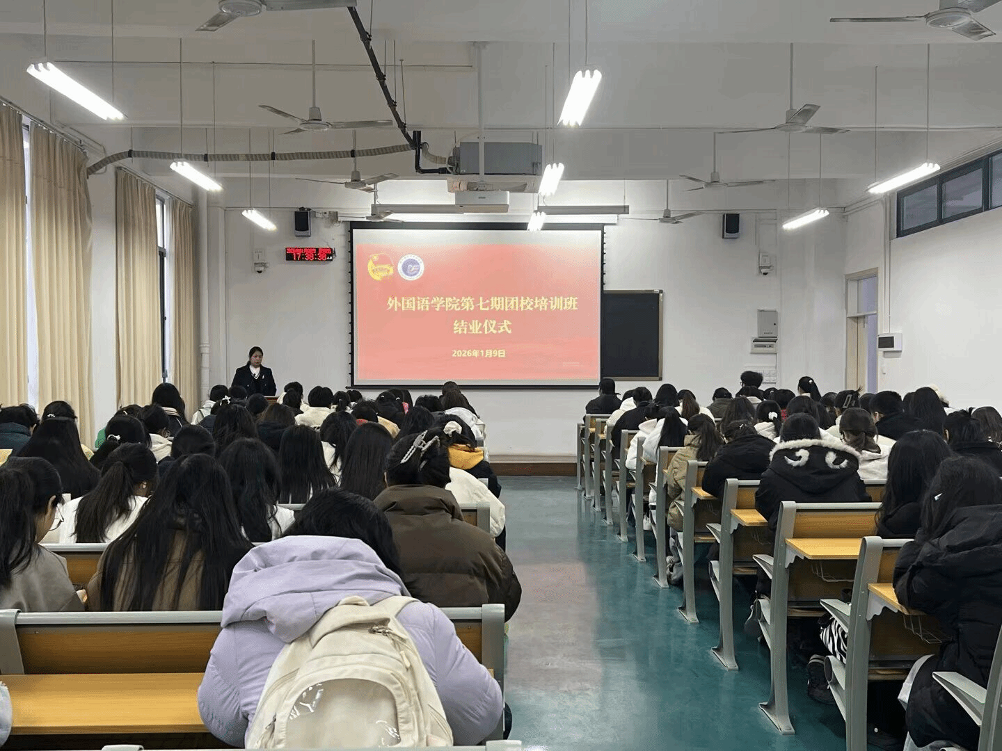 || 2026年1月9日下午,外国语学院第七期团校培训班结业仪式在北校区南楼S205教室顺利举行。学院党委副书记韦翠兰、学院团委副书记李秀瑜出席仪式,团校全体学员共同参加。在结业仪式上,学院团委副书记李秀瑜首先总结了本期团校培训成果,并宣读了结业决定和优秀学员表彰决定。随后,学院党委副书记韦翠兰为23名优秀学员颁发了荣誉证书,学院团委副书记李秀瑜为结业学员代表颁发了结业证书。学院党委副书记韦翠兰在总结讲话中向顺利结业的全体学员表示祝贺,...