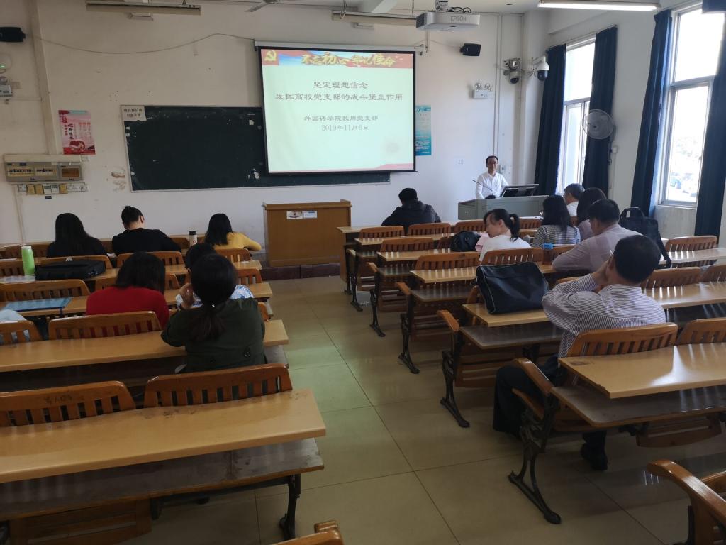 11月6日在N205教室,外国语学院教工党支部书记梁毅给全体教工党员上了一堂主题为“坚定理想信念,发挥高校党支部的战斗堡垒作用”的党课。梁书记指出教工党支部要发挥好党支部的战斗堡垒作用必须做好下面几个方面的工作:一是要加强理论学习,抓好班子建设,强化班子集体领导能力;二是要强化宗旨意识,深入教职工中间,积极为教职工办实事;三是要强化对教职工的教育帮带工作,带好每个教职工,确保其健康成长。