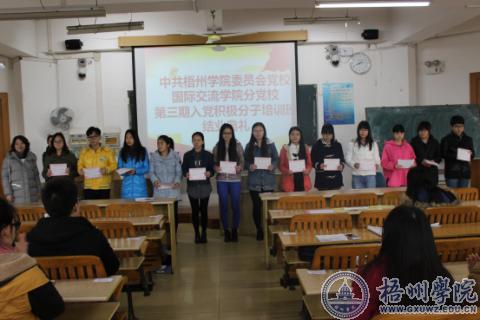 在结业典礼上,吴茜老师宣读了本次培训班的优秀学员名单,并由冀宁老师为他们颁发了荣誉证书;接着,学员代表欧阳天婷发言,她与大家分享了在培训班的心得与体会;最后,冀宁老师总结了本次培训班的成果及不足的地方,她针对于培训班学员培训时期的表现提出了“三个不够”及“三个希望”即学习深度不够,学习时间不够,学习理论不够;希望大家加强理论学习,希望大家理论联系实际,希望大家端正入党动机。
