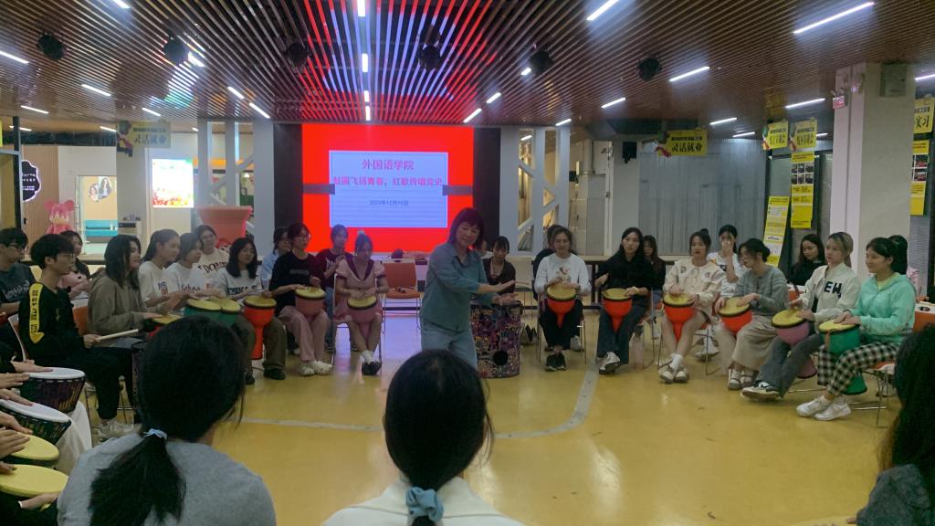 12月15日下午,外国语学院以“鼓圈飞扬青春,红歌传唱党史”为主题,在学校体育馆邑谷中心举办了党史学习教育团体心理辅导活动。本次活动由学校关工委的石夏莉副教授带领2022级翻译专业60余名学生开展活动。