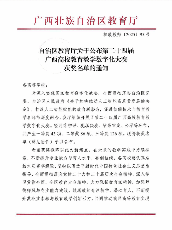 近日,自治区教育厅公布了第二十四届广西高校教育教学数字化大赛获奖名单。外国语学院首次组队参加“AI赋能教学创新应用案例”赛项,与区内高校推荐的51项文科课程案例同台竞技。经过激烈角逐,由曾秦老师带领的课程团队凭借参赛作品《AI赋能英语教学法:立德·睿导·慧语》,荣获该赛项区级三等奖。