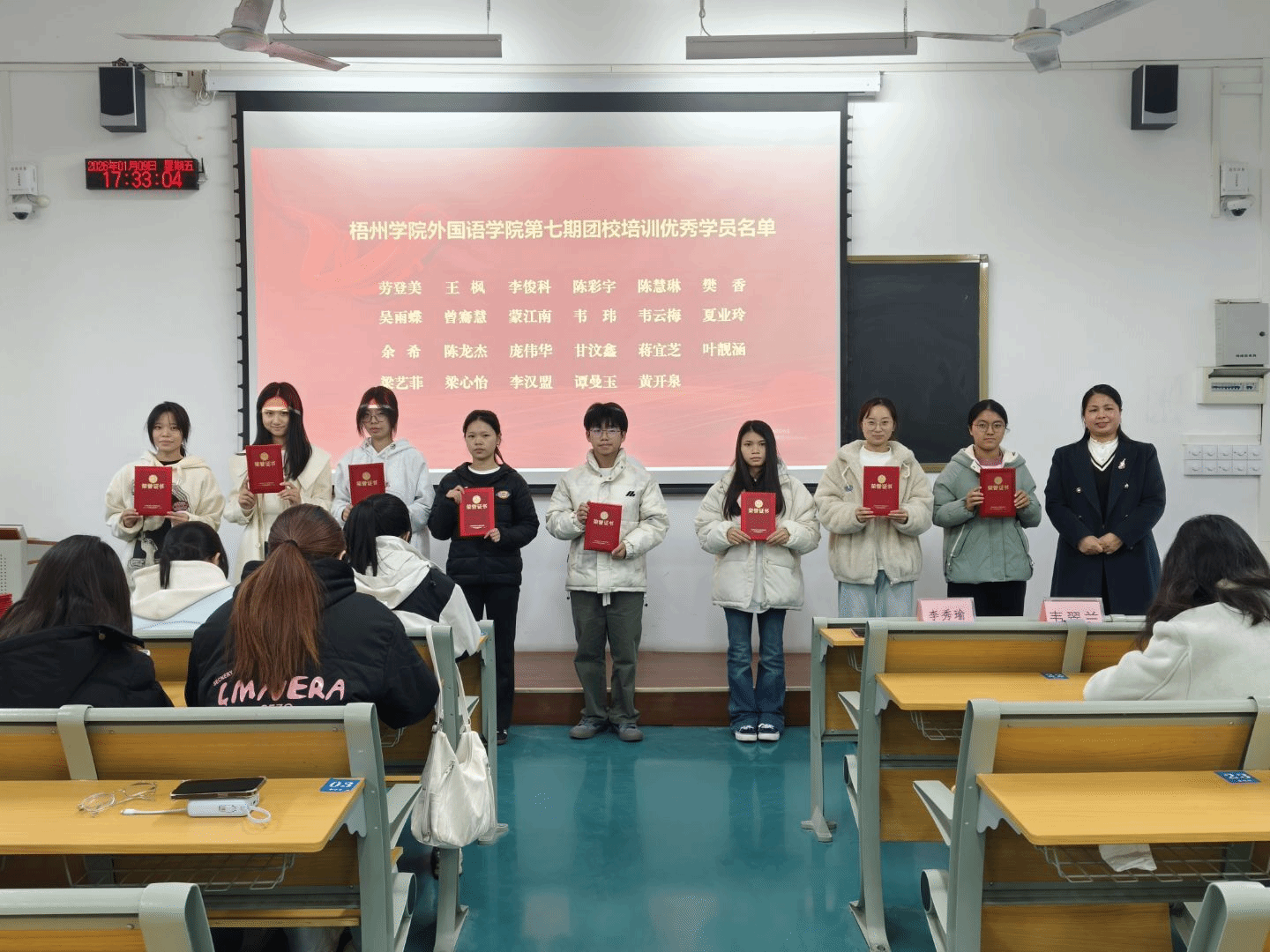 2026年1月9日下午,外国语学院第七期团校培训班结业仪式在北校区南楼S205教室顺利举行。学院党委副书记韦翠兰、学院团委副书记李秀瑜出席仪式,团校全体学员共同参加。