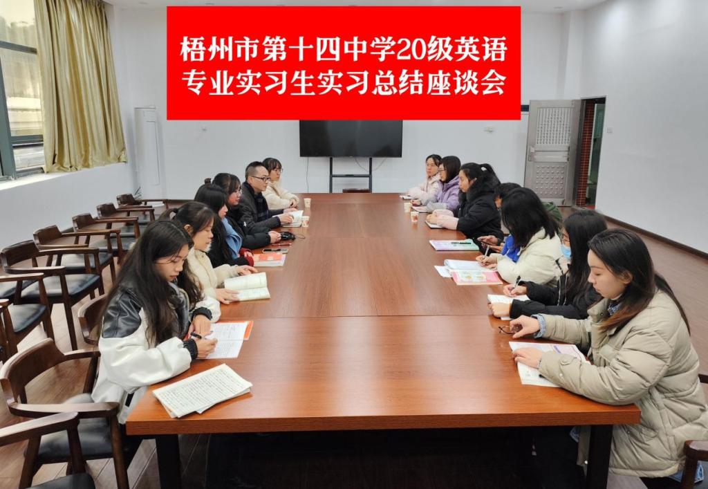 为了解毕业生实习情况,2023年12月19日下午,梧州学院老师到梧州市第十四中学实习基地看望20级英语专业实习生,并召开实习总结座谈会。十四中副校长庞娉婷、教务处副主任霍玮、资助办副主任龙世高,梧州学院英语专业教研室主任蒋樟健、教师李俐以及实习生参加了座谈会。