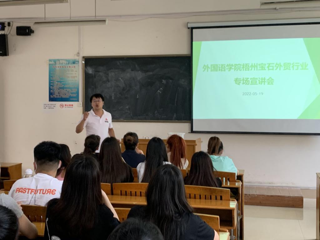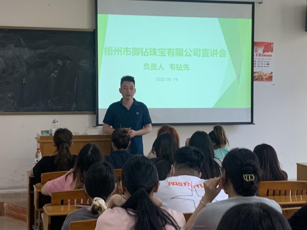 5月19日下午,我院邀请梧州市御钻珠宝有限公司负责人韦钻先、珀利贸易有限公司负责人英萸为我院毕业生做职业生涯宣讲活动。我院全体在校毕业生参加。