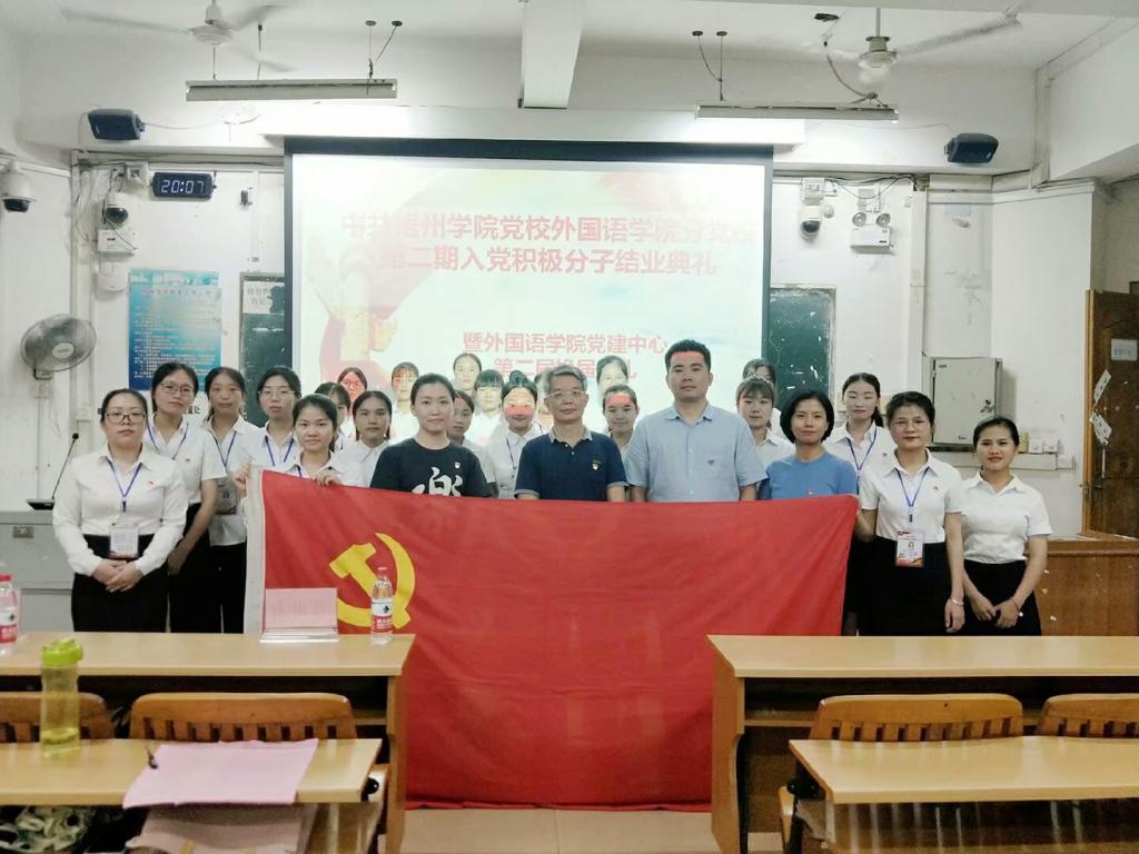 梧州学院党校外国语学院分党校第二期入党积极分子结业典礼暨外国语学院党建中心换届典礼于6月13日晚在明理楼S403举行。出席本次典礼的有外国语学院党总支部书记莫世有同志、外国语学院党总支部副书记庄雨同志、外国语学院专职组织员吴茜同志、外国语学院学生第二党支部书记关媛华同志、外国语学院学生党员、各班团支书以及党建中心全体成员。
