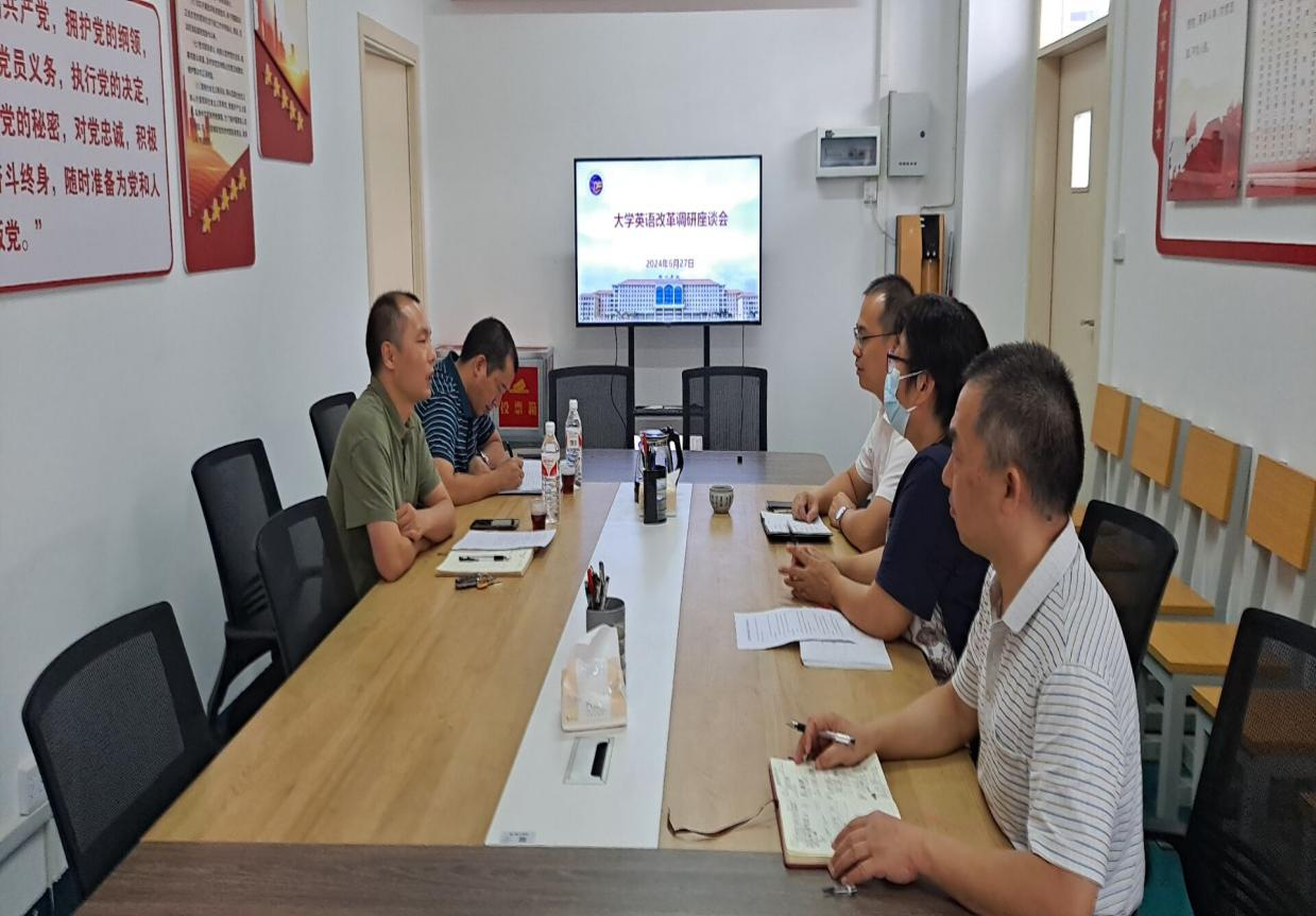 6月27日,教务处处长方勇、副处长彭金虎来外国语学院调研大学英语教学改革工作。外国语学院党委书记朱宇乾、院长宋银秋、副院长晏劲松参加调研。