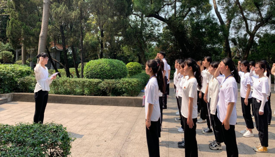 首先,外国语学院党委副书记庄雨同志在梧州珠山公园内讲述了梧州作为广西红色革命摇篮,无数革命先烈在这里为了民族解放事业甘愿抛头颅、洒热血的故事,呼吁青年学生要志存高远,牢固树立跟党走的信念。接着,学院团委书记书记梁眉同志带领青年学生们重温入团誓词。入团誓词铿锵有力,护党决心坚定不移。最后,大家怀着崇敬的心情,向长眠在革命公墓的烈士肃立默哀,并向革命烈士敬献花圈,表达了对革命先辈的敬仰与追思。