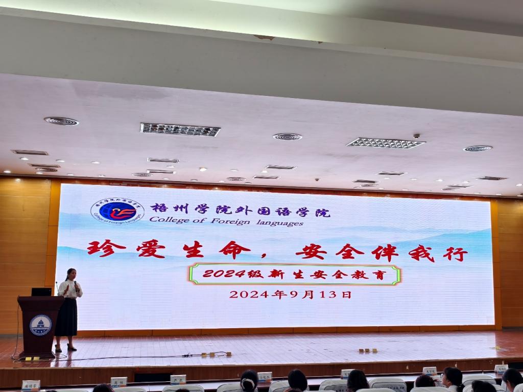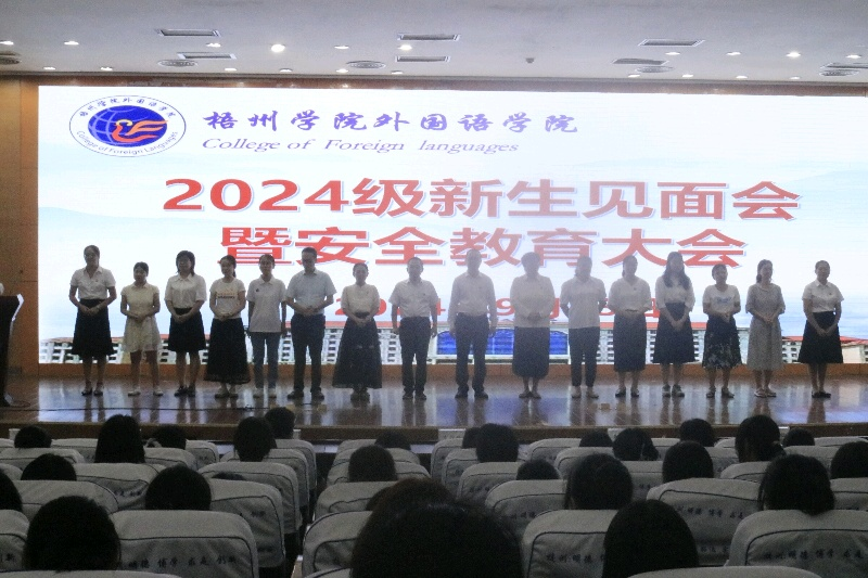 2024年9月13日,外国语学院举行了2024级新生见面会暨安全教育大会。学院领导班子参加会议,学院党委副书记韦翠兰主持会议。