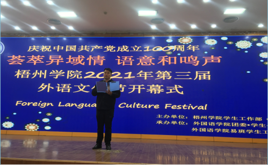 据悉,本届外语文化节围绕“学贯中外,共筑梦想”主题,以“弘扬中华文化、促进文明互鉴、加强校园文化建设”为主线,分别开展寻找“清晨百灵鸟”、 “英语百词大战”比拼 、 “优秀课堂笔记”评选、“双语览时政”知识竞赛、庆祝中国共产党成立100周年歌曲大赛、异域文化节、影视配音大赛等系列主题活动,活动时间将持续一个学年。