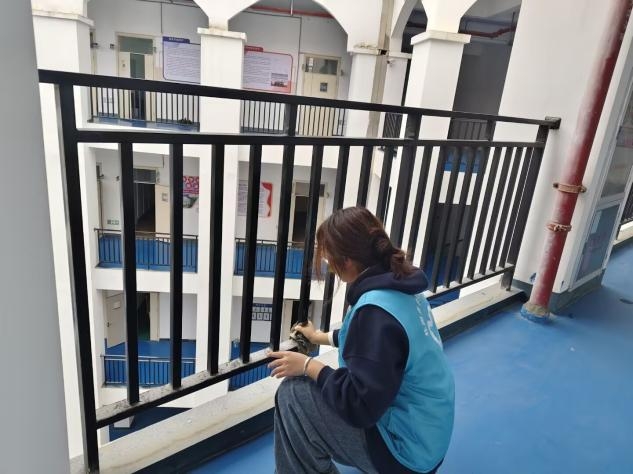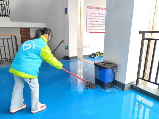 青年志愿者对教学楼南楼的楼梯间、走廊、扶手、栏杆等部位进行清洁清扫,她们认真细致,清洁到每一个角落。此次清洁行动不仅美化了教学环境,也是"实践育人"的重要举措,通过沉浸式劳动教育,引导同学们在服务中深化对雷锋精神时代内涵的理解,在青年学生当中播撒了奉献与责任的种子。