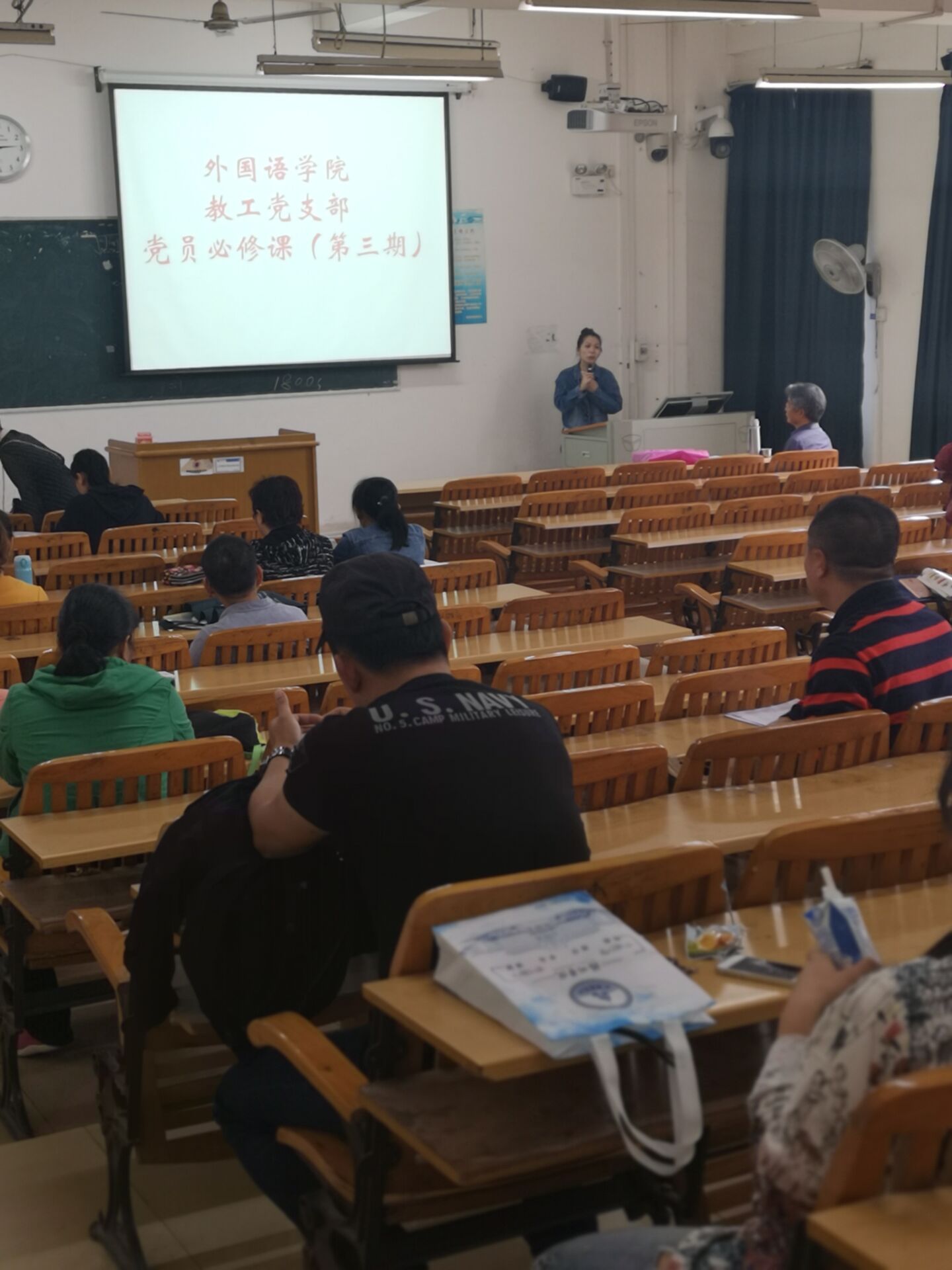2018年10月24日下午,外国语学院教工党支部组织党员在北楼205教室集中学习党员现代远程教育“第三期”必修课。党员们通过观看广西党员现代远程教育必修课视频,了解了广西壮族自治区成立60周年取得的重大成就,激发了热爱广西、建设广西的热情,决心结合自己的工作岗位为建设广西更加美好的明天贡献自己的力量。
