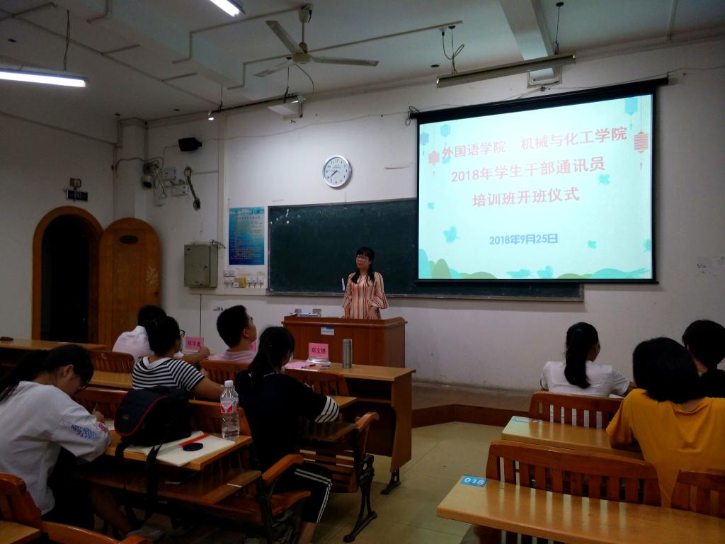近日,外国语学院联合机械与化工院在北校区明理楼S605教室举办了新闻写作系列讲座。机化学院党委副书记许玉婷,学生工作处就业办公室主任班华意及四十名学生干部通讯员出席了开班仪式。开班仪式由外国语学院党总支副书记庄雨主持。