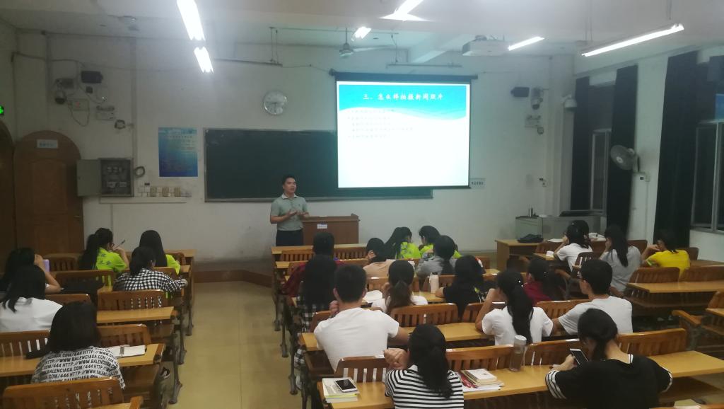 开班仪式结束后,由梧州学院党委宣传科副科长郑文锋为两个学院的学生干部通讯员从消息写作、新闻写作、新闻摄影三个专题作了具体培训。课程为期14个课时,在讲座上,郑文锋同志以“消息写作,让读者对你的文字怦然心动”和“让新闻人物跃然纸上”以及“新闻摄影,让你的照片会说话”三个专题对于消息写作、人物通讯写以及作摄影等几方面的知识要点、理论层面、实践操作层面作了阐述,并运用了大量的正反两面的案例进行分析。