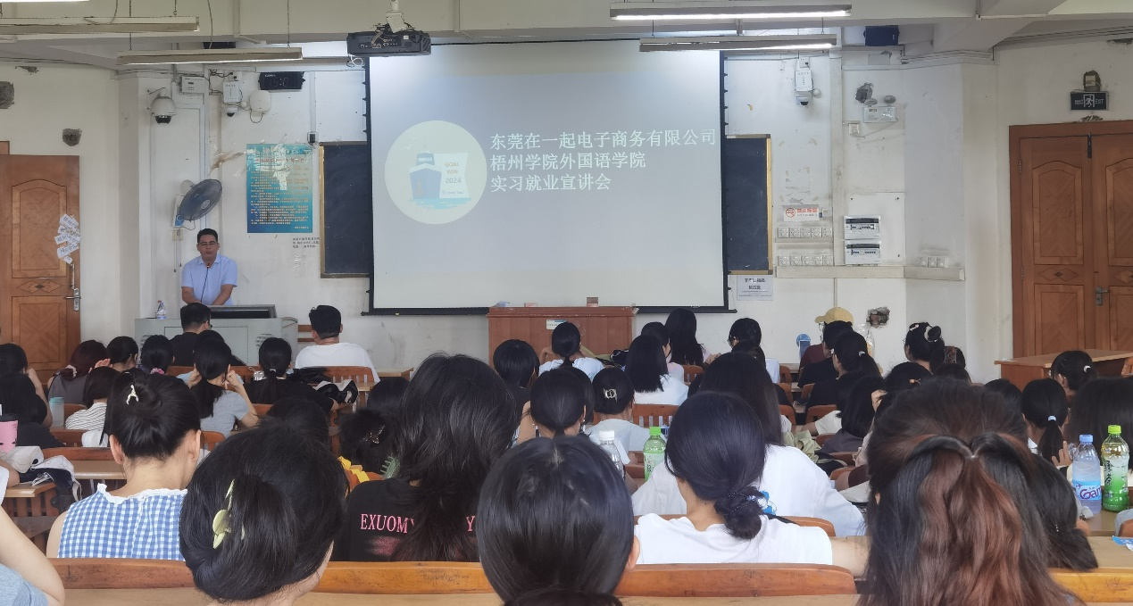 9月19日,外国语学院邀请东莞在一起电子商务有限公司到校开展学生实习及就业宣讲。2021及商务英语专业和翻译专业的学生参加宣讲活动。
