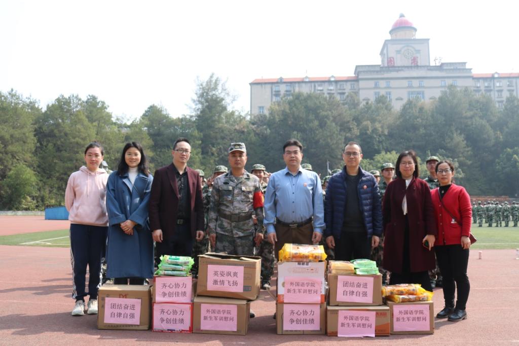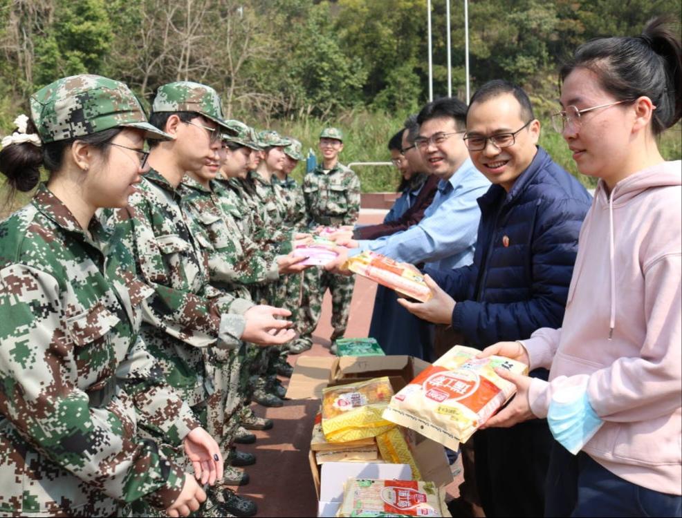 2月28日,外国语学院领导朱宇乾、刘卫东来到军训现场慰问参训新生,并给军训新生送上面包、葡萄糖等慰问品,为同学们补充能量和体力。同学们收到慰问品,训练热情高涨,活力满满。