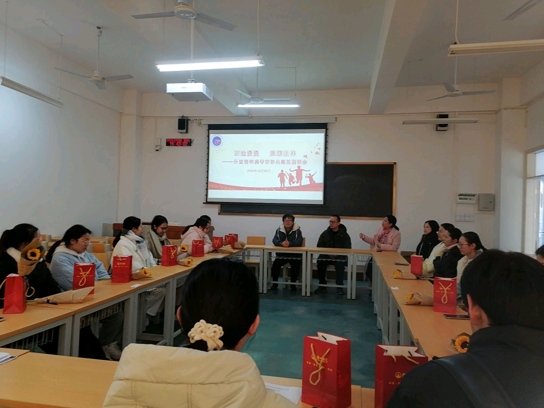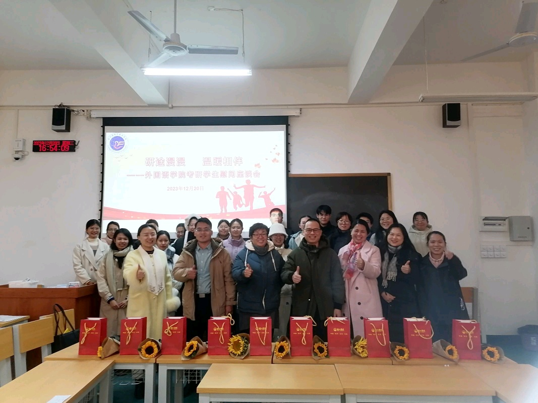 为更好地引导考研学子积极准备研究生入学考试,帮助学生树信心、提动力、增效率,最大程度缓解考研学子因考试临近而带来的心理压力,12月20日,外国语学院在北区S401开展考研学生慰问座谈会,给正在奋斗的莘莘学子送去祝福、温暖和关怀。学院领导班子、教研室主任、教师代表、毕业班辅导员及2020级考研学子们参加此次活动。