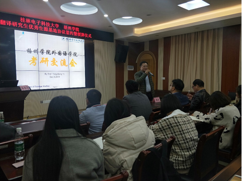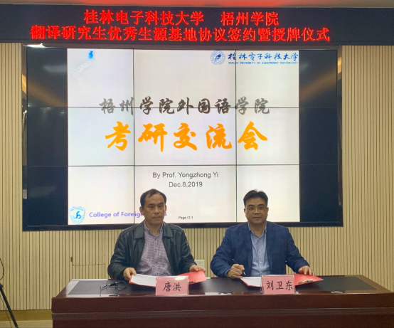 12月8日晚上,桂林电子科技大学翻译研究生优秀学生源基地签约授牌仪式暨考研宣讲会在我校顺利举行。桂林电子科技科技大学外国语学院副院长唐洪、研究生教育系易永忠主任,我校外国语学院院长刘卫东、党总支副书记庄雨出席仪式,我校外国语学院唐秀文老师主持仪式。