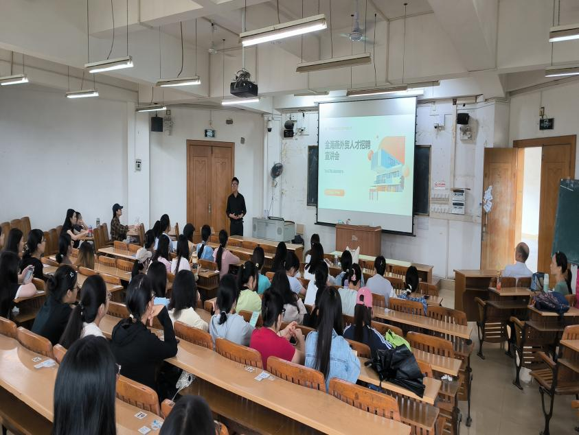 9月24日,广东金海燕进出口服务有限公司到外国语学院进行实习就业宣讲。外国语学院2021级商务英语专业和翻译专业的学生参加活动。