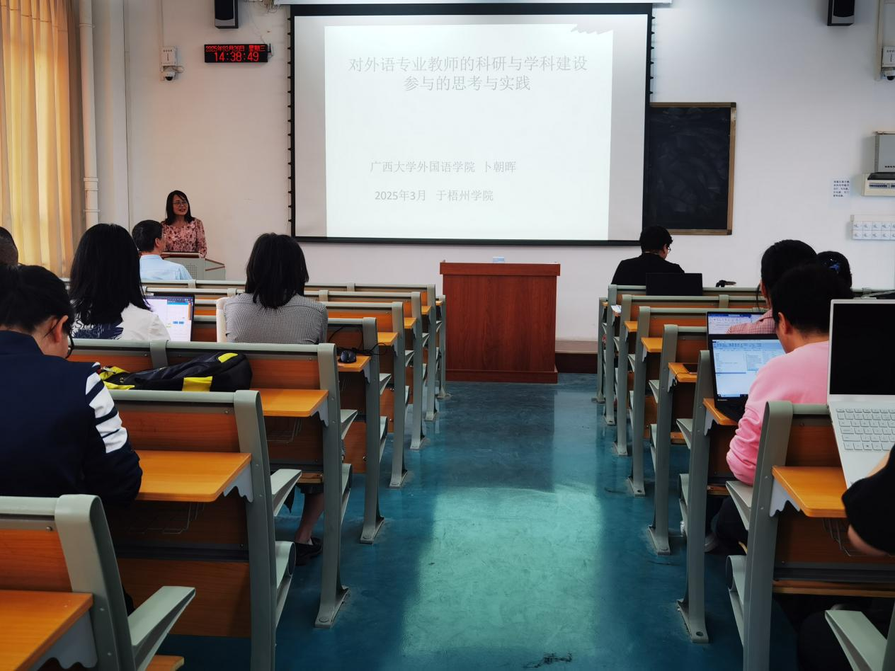 3月26日下午,广西大学卜朝晖教授应邀到外国语学院作题为“对外语专业教师的科研与学科建设参与的思考与实践”学术讲座。外国语学院院长宋银秋以及全体教师参加讲座。