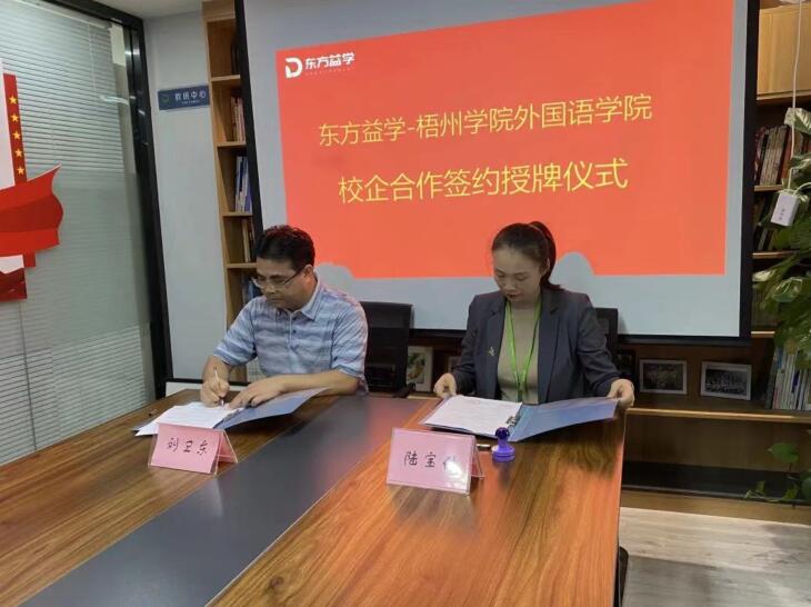 4月26日下午,外国语学院与南宁东方益学教育培训集团在南宁签订校企教学科研实习基地协议和授牌仪式。双方就学生实习实训情况、校企教学科研合作事项进行了会谈。双方的合作,为积极推进我院英语专业建设,促进英语类专业学生创新能力和实践能力的培养,加快学术、和教学成果的转化起到重要作用。