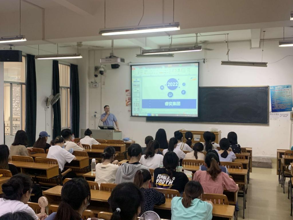 宣讲会上,睿奕公司销售总监李裕杰介绍了公司的营业模式以及招聘计划。他结合自身经历,为毕业班的同学分析当前大学生的就业趋势和职业规划,忠告在座的各位同学,当代毕业生不要一味地追求薪资,更应该在起步的时候多学习工作经验,鼓励年轻人积极开拓进取,通过拼搏赢得未来。