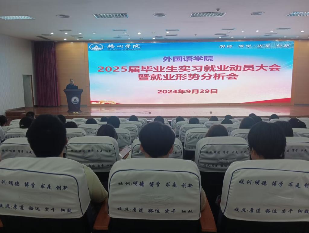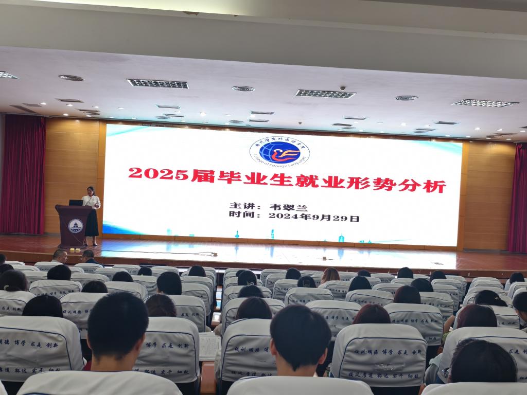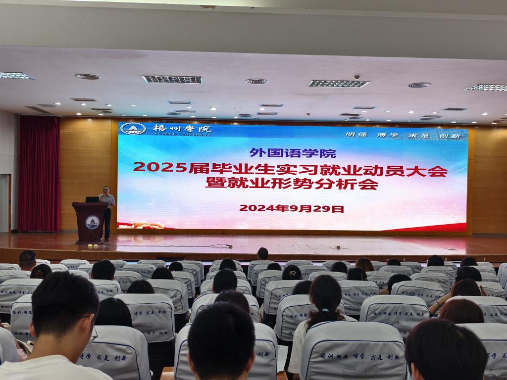 9月29日下午,外国语学院召开2025届毕业生实习就业动员暨就业形势分析会。学院领导班子、教师代表和2025届全体毕业生参加会议。学院党委副书记韦翠兰主持会议。