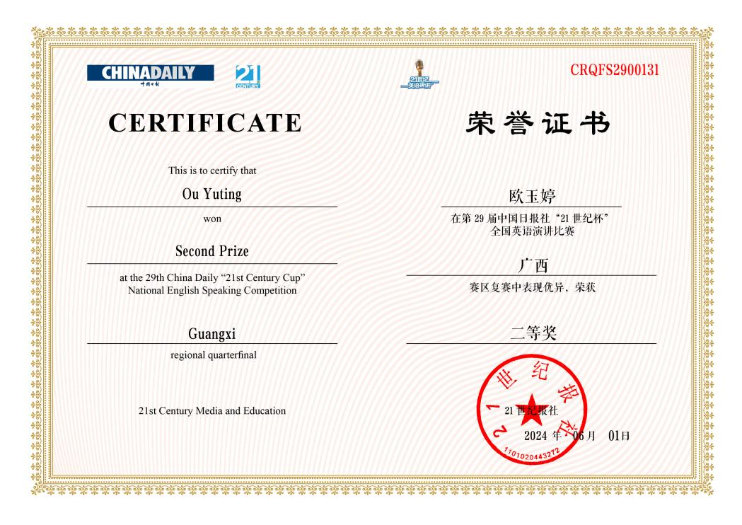 近日,在第29届中国日报社“21世纪杯”全国英语演讲比赛大学组地区复赛中,外国语学院22英语3班欧玉婷荣同学们获广西赛区二等奖,22翻译1班梁梦圆同学们荣获广西赛区三等奖。