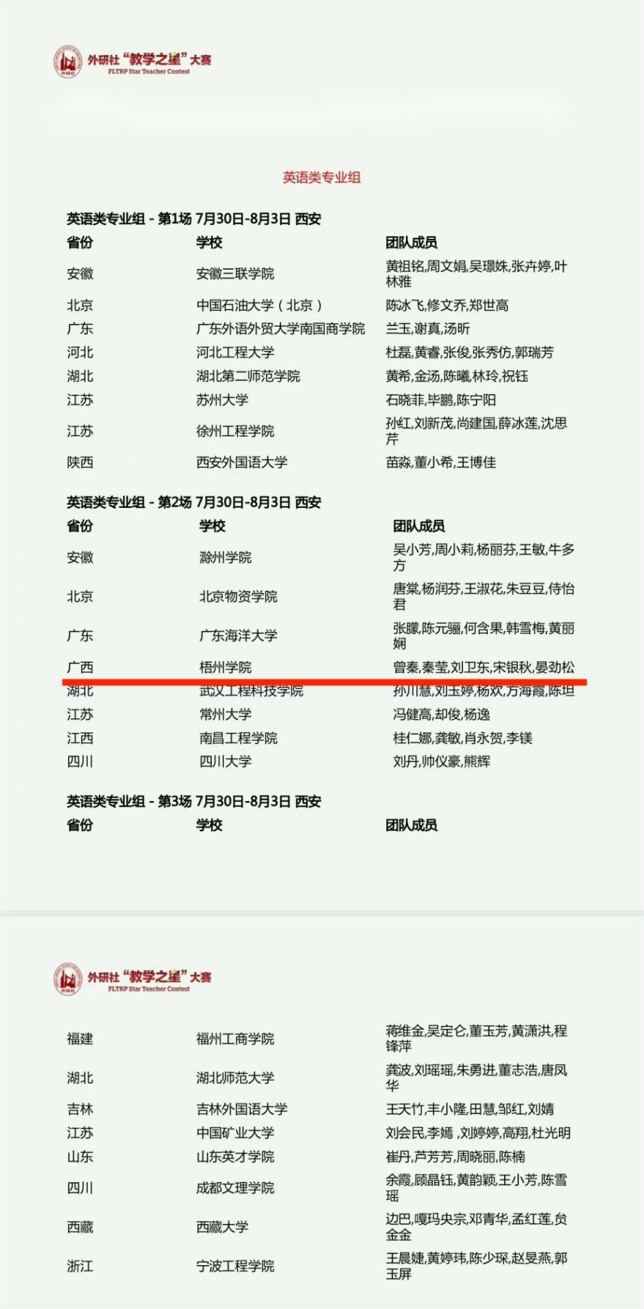 近日,2023年外研社杯 “教学之星”大赛组委会公布了全国复赛结果。我院曾秦老师率领的团队获英语专业组(全国复赛)特等奖,邹燕老师率领的团队获大学英语组(全国复赛)一等奖。曾秦老师的团队同时晋级全国半决赛,是英语专业组唯一的广西高校代表队。