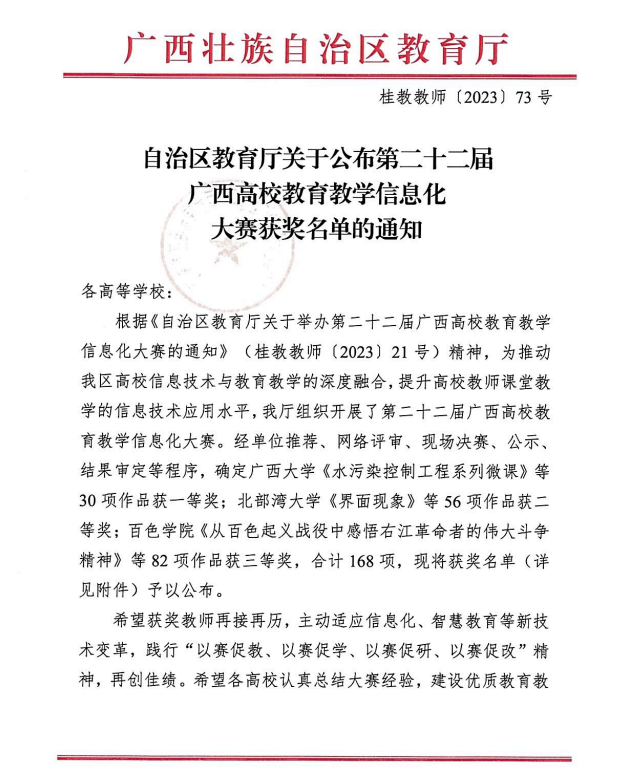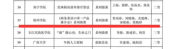近日,自治区教育厅公布了第二十二届广西高校教育教学信息化大赛获奖名单。外国语学院曾尚春团队的《商务英语口译--产品推介会》系列微课荣获系列微课组二等奖;伍靖团队的《中国文化概况》荣获小规模限制性在线课程(SPOC)组二等奖。