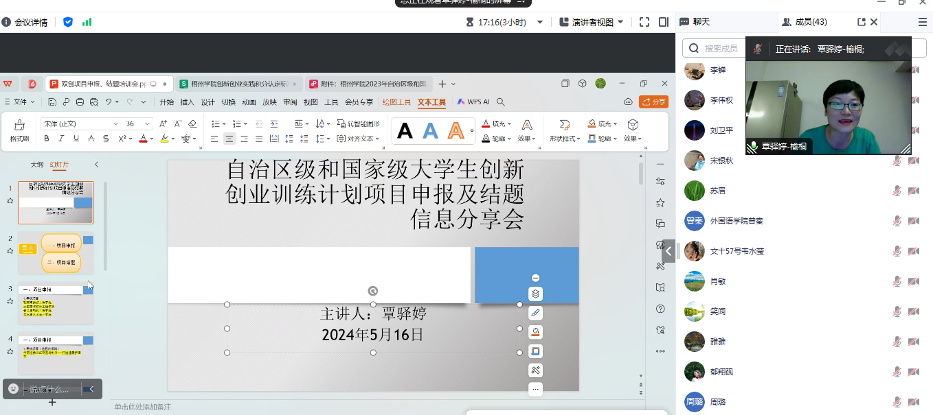 为加强大学生创新创业训练计划项目的申报组织工作,外国语学院在5月15日—16日,召开线上专题培训会。外国语学院邀请了电子与信息工程学院李志军老师以及本学院的覃驿婷、肖敏老师面向全院教师和部分学生进行政策解读和申报辅导。