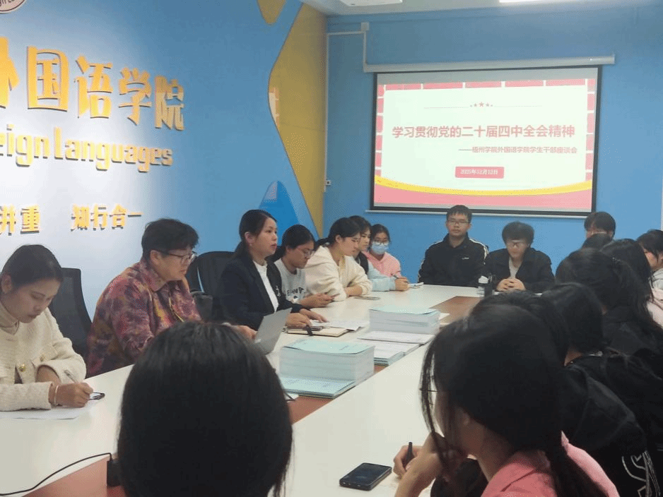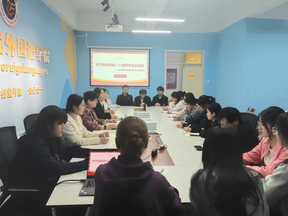 12月12日,外国语学院在北区实训楼M201开展了“学习贯彻党的二十届四中全会精神”学生干部专题座谈会。学院院长宋银秋、学院党委副书记韦翠兰及团委副书记李秀瑜以及学院团学组织学生干部代表参与了本次会议。