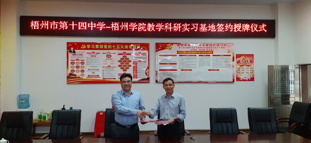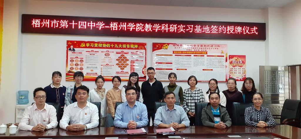 10月24日上午,外国语学院与梧州市第十四中学举行教学科研实习基地签约授牌仪式。在仪式前,双方就学生见习实习情况、校园文化建设、实践教学科研合作事项进行了商谈。双方的合作,有利于推进外国语学院英语专业学生实践能力的培养和提高地方中学英语基础教育的质量。同时,也是外国语学院党总支开展“不忘初心、牢记使命”主题教育“检视问题”工作中师生反映教学科研实习基地匮乏问题的解决措施之一。