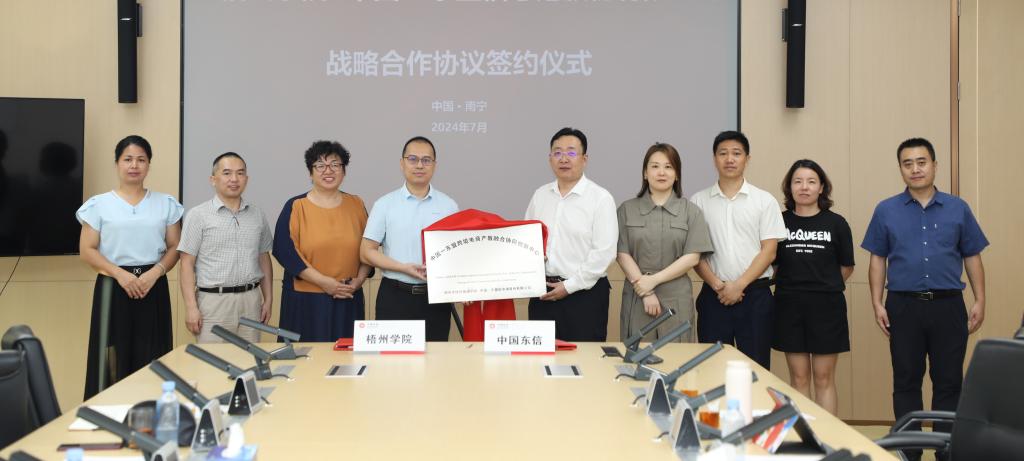 7月16日下午,外国语学院与广西东信数教科技有限公司在南宁举行共建“中国—东盟跨境电商产教融合协同创新中心”战略合作框架协议签约及授牌仪式。中国—东盟信息港股份有限公司高级副总裁吴玉青,中国东信教育行业总监、广西东信数教科技有限公司总经理孔陈闽,外国语学院党委书记朱宇乾、院长宋银秋出席仪式。