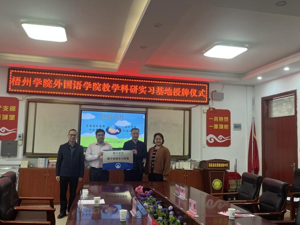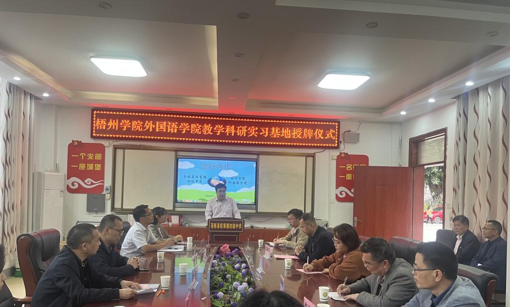3月14日,在梧州市苍梧县旺甫镇初级中学校区,外国语学院与苍梧县旺甫镇初级中学举行教学科研实习基地授牌仪式。外国语学院党委书记朱宇乾、院长刘卫东和外国语学院相关管理人员、教师及学生代表、苍梧县教育局副局长李蓉、旺甫镇初级中学校长莫剑宇以及部分教师代表参加揭牌仪式。