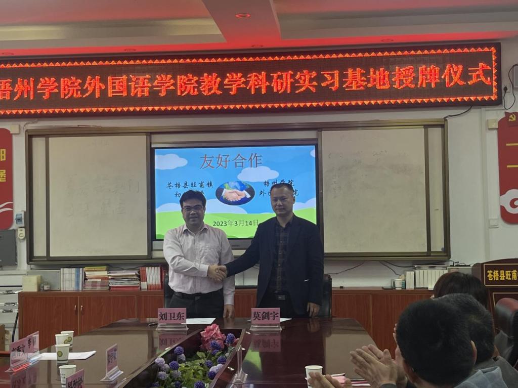 刘卫东院长代表外国语学院致辞,介绍了外国语学院的人才培养模式和师资队伍构成,希冀与苍梧县旺甫镇初级中学携手共建教学科研实习基地。在授牌仪式上,双方就学生见习实习情况、校园文化建设、实践教学科研合作事项进行了深入交流。会上,刘卫东院长和莫剑宇校长签署了双方的合作协议,并举行了揭牌仪式。