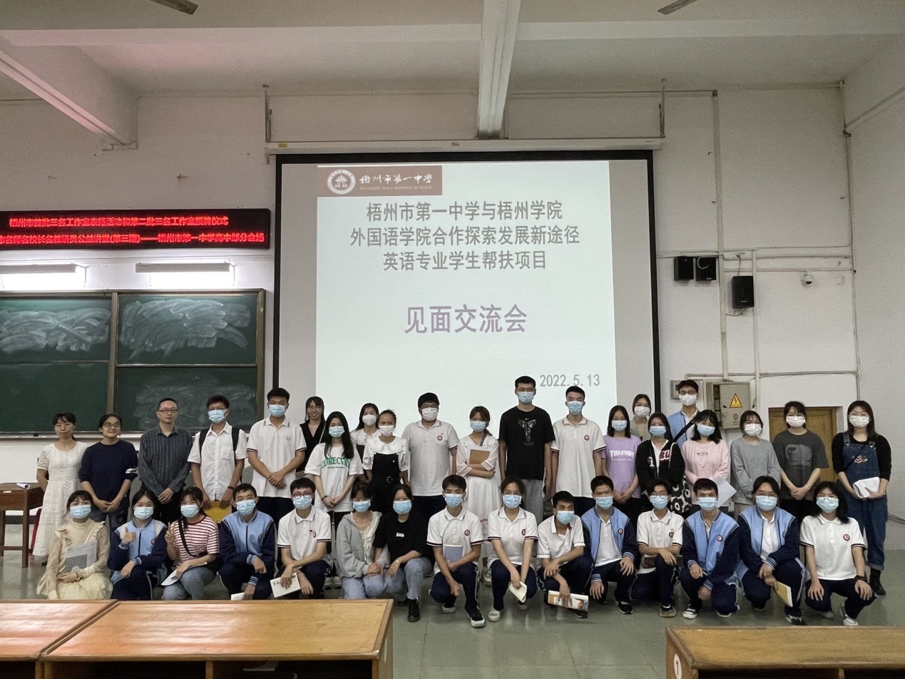 5月13日,外国语学院英语专业学生在带队老师的带领下到梧州市第一中学参加了学生帮扶项目见面交流会。会上,16位优秀的英语专业学生与梧州一中高一、高二的16位帮扶学生进行一对一、面对面的交流,并初步为帮扶学生制定了个性化的指导计划。此帮扶项目是加强我院和梧州市本地中学的教育科研深度合作、协同人才培养的新模式,也是校校联合,互利共赢、共同进步的有效尝试。外国语学院也将以此为契机,进一步提高人才培养质量。