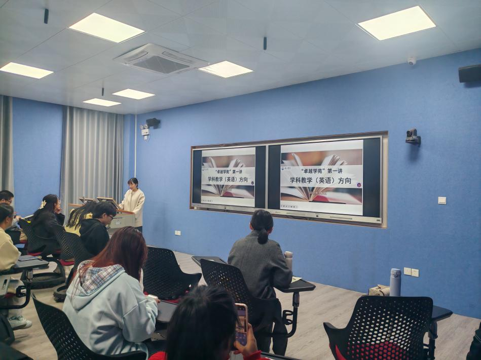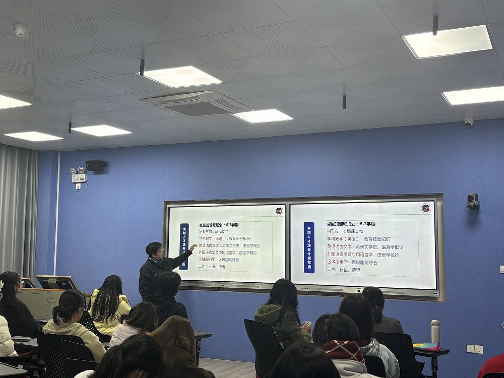 最后,宋院长总结了本次活动。她指出,学院为卓越班的同学提供了针对性的支持,包括开设翻译实务、教育综合知识、英美文学史、语言学概论、区域国别综合等课程,还开放了两间专属自习室,为学生提供良好的学习环境。宋院长还以2010届校友马俊杰博士和2013届校友高秀巍博士的成功故事为例,激励同学们以优秀校友为榜样,通过自身努力创造更加辉煌的未来。