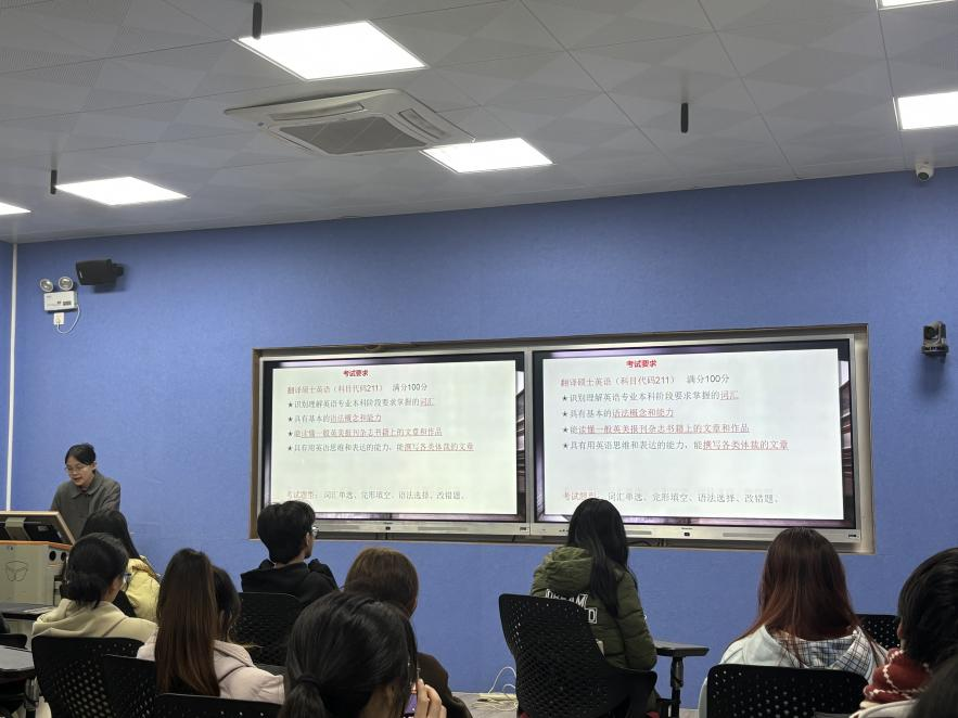 刘金妮老师从MTI(翻译硕士)方向出发,讲解了该专业的培养目标与考试特点。她详细分析了翻译硕士英语、翻译基础和汉语写作与百科知识的具体题型与备考方法,建议同学们结合黄皮书等专业考研资料,系统训练笔译能力。刘老师强调了翻译硕士考研的复习节奏,建议同学们按照两年复习规划稳步推进,在寒假期间完成基础积累,为冲刺阶段做好充分准备。