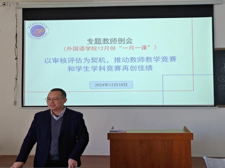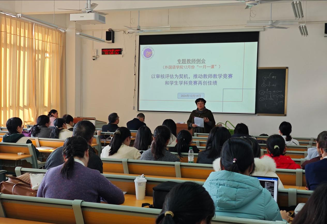 12月18日,外国语学院开展“一月一课”活动,对2024年组织参加教师教学竞赛及学生学科竞赛工作进行总结。全体教职工参加了活动。